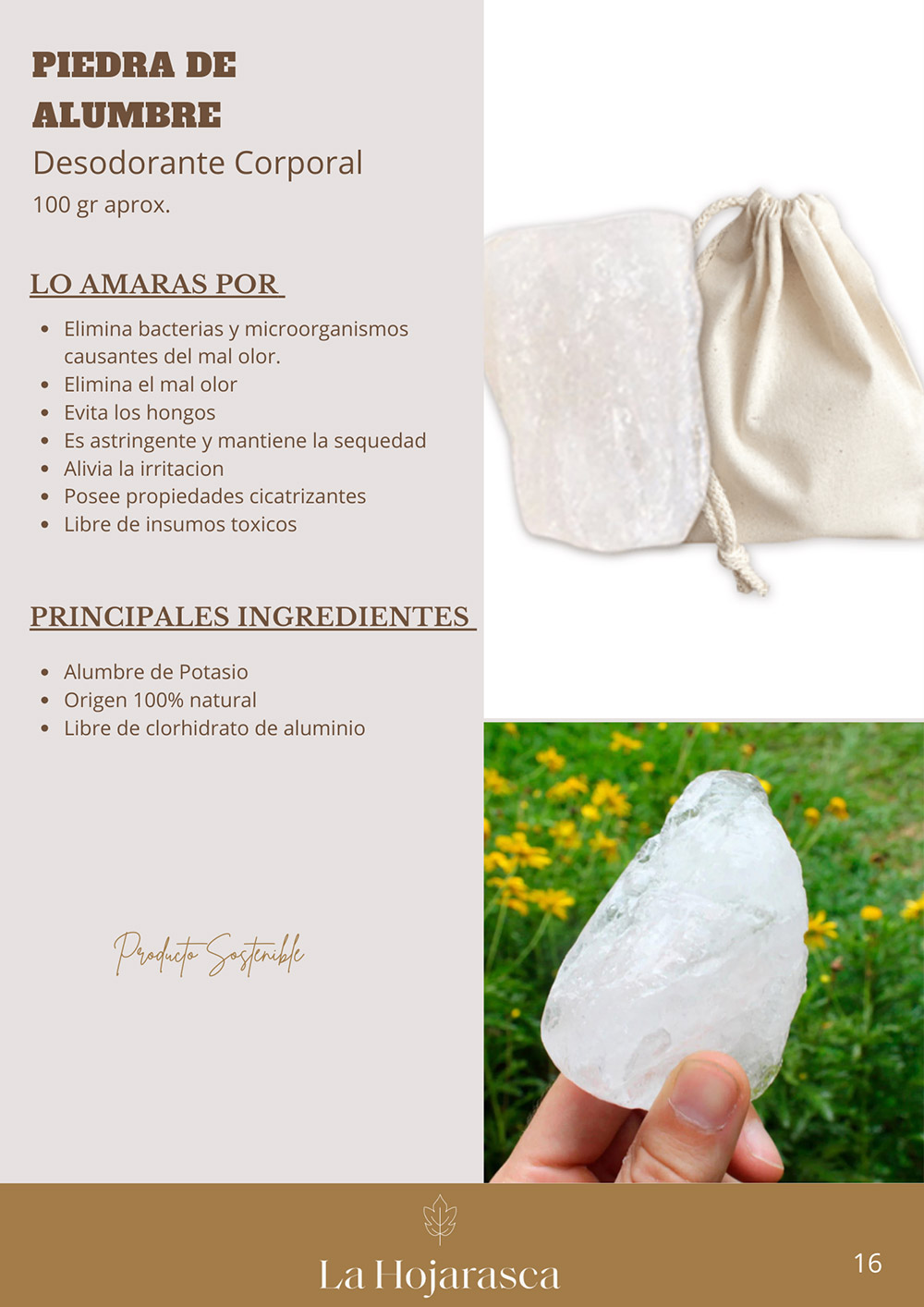 Mineral natural utilizado tradicionalmente como desodorante. Ayuda a inhibir bacterias responsables del mal olor mientras permite que la piel transpire de forma natural.